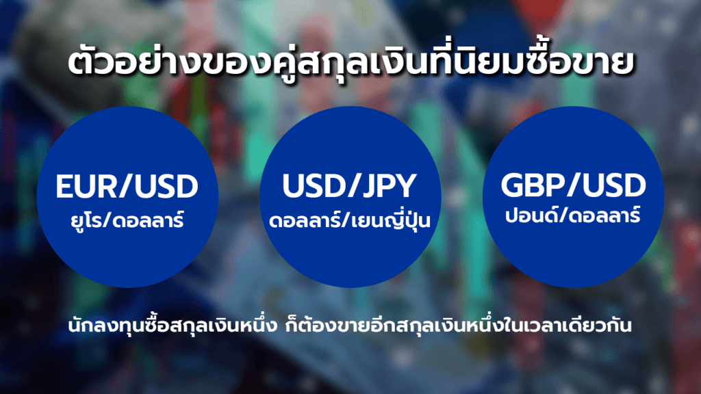 การซื้อขายในตลาด Forex จะทำผ่านคู่สกุลเงิน ซึ่งหมายถึงการซื้อสกุลเงินหนึ่งและขายอีกสกุลเงินหนึ่งพร้อมกัน ตัวอย่างของคู่สกุลเงินที่ได้รับความนิยม ได้แก่:
